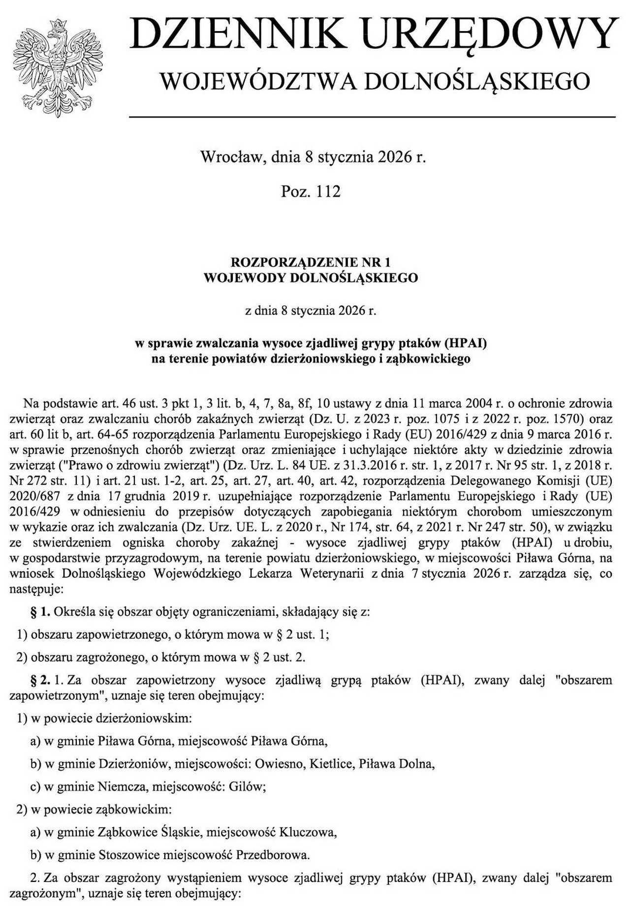 W związku ze stwierdzeniem ogniska choroby zakaźnej - wysoce zjadliwej grypy ptaków (HPAI) u drobiu, w gospodarstwie przyzagrodowym, na terenie powiatu dzierżoniowskiego, w miejscowości Piława Górna, na wniosek Dolnośląskiego Wojewódzkiego Lekarza Weterynarii z dnia 7 stycznia 2026 r. wydano zarządzenia, których treść prezentujemy poniżej. Prosimy rolników i osoby hodujące drób o zapoznanie się z rozporządzeniem.